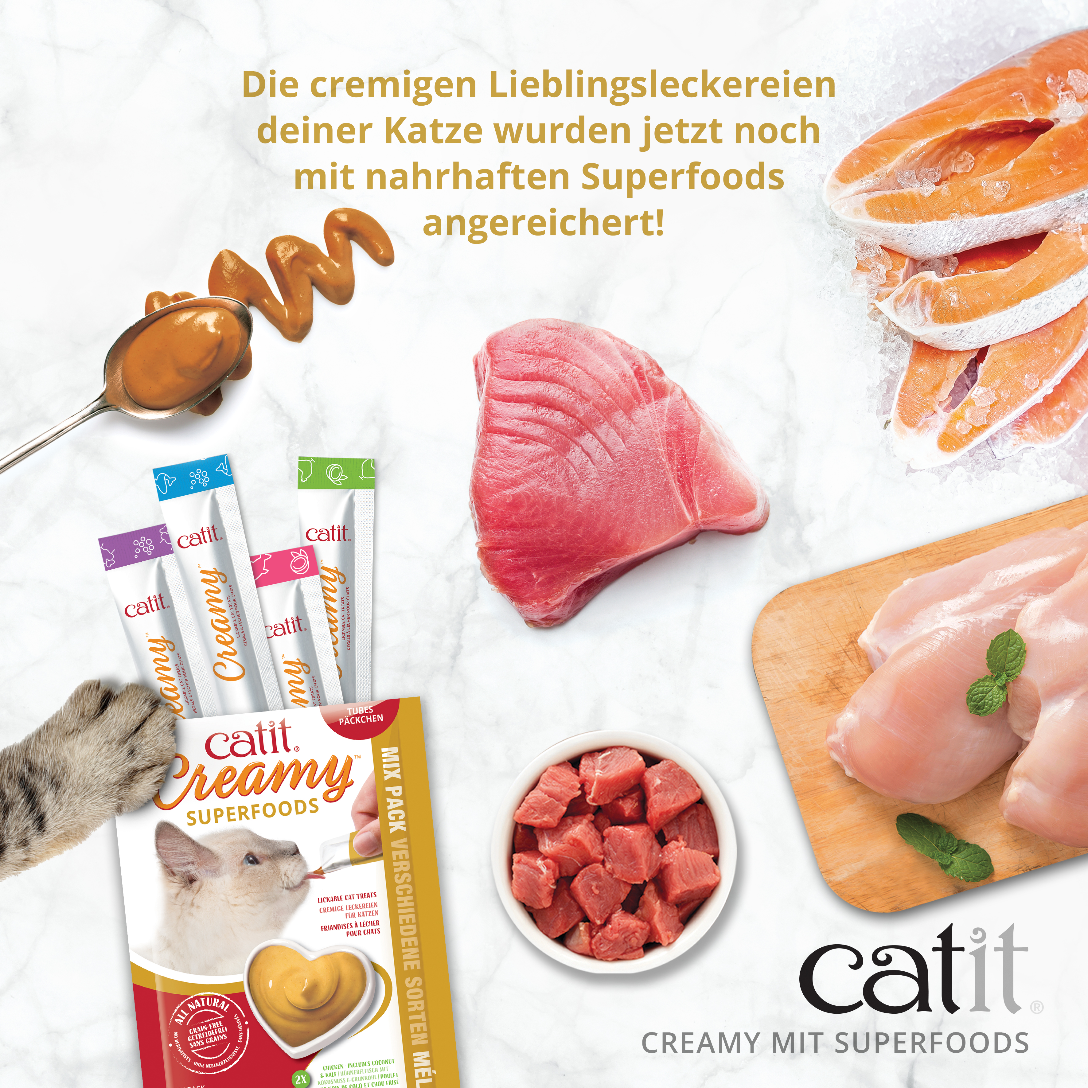 - Enthält 4 Päckchen Catit Creamy Superfoods á 10 g. Die Packung mit verschiedenen Sorten enthält 8 Päckchen á 10 g (2 x Hühnerfleischmit Kokosnuss & Grünkohl, 2 x Lammfleisch mit Quinoa & Chia, 2 x Lachs mit Quinoa & Spirulina, 2 x Thunfisch mit Kokosnuss & Wakame)