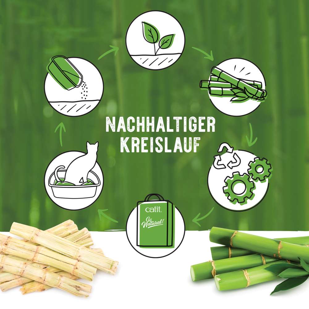 Die ultraleichte Catit Go Natural! Katzenstreu wird aus Bambus- und Bagassefasern hergestellt, die aus recycelten Altmaterialien aus der Möbel- und Lebensmittelindustrie gewonnen werden. Wir verwenden diese Materialien wieder, um eine äußerst wirksame, umweltfreundliche Katzenstreu mit natürlichen antibakteriellen und geruchshemmenden Eigenschaften herzustellen.