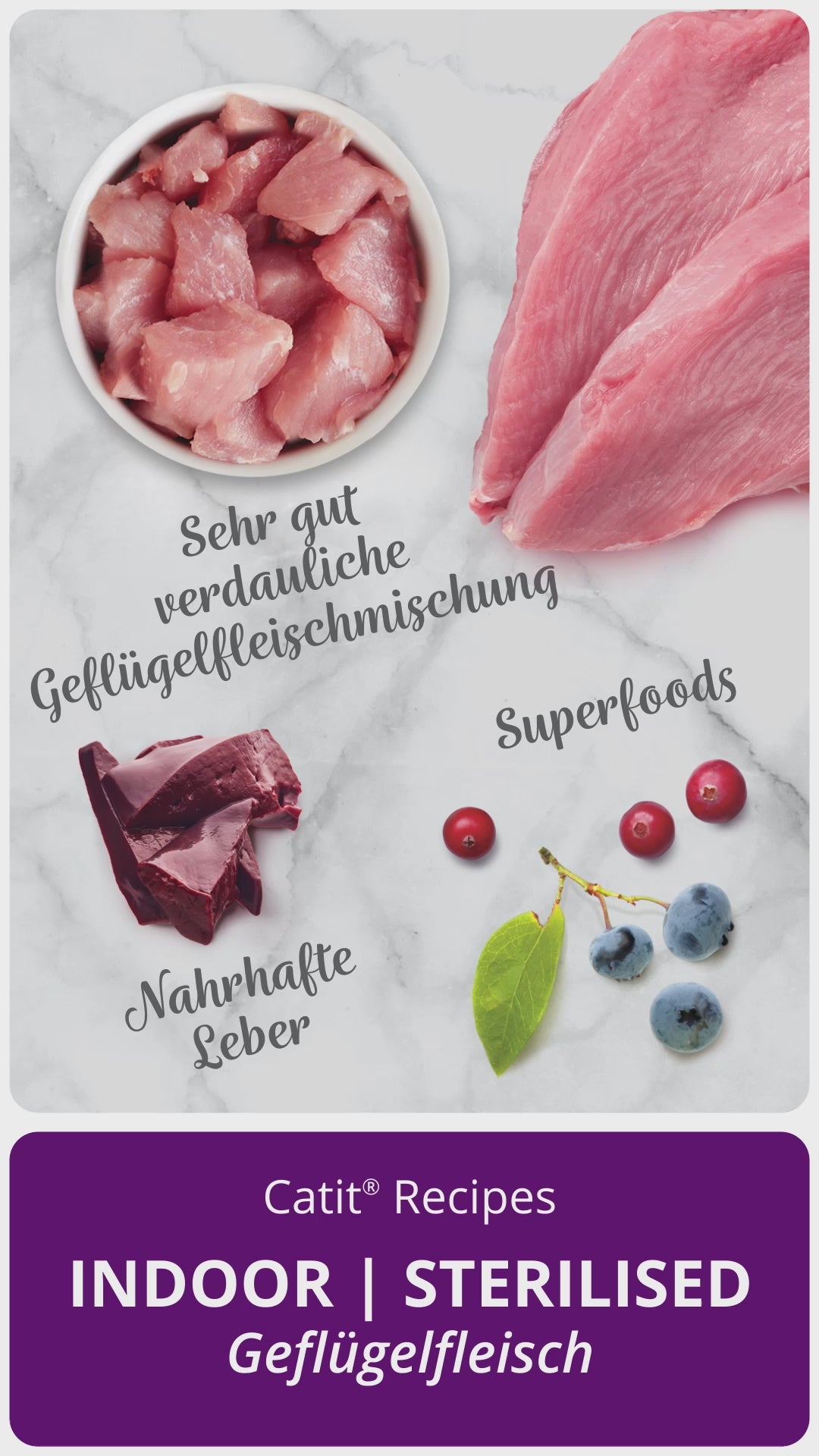 Catit Recipes INDOOR Geflügelfleisch ist das ideale Futter für jeden Tag für Hauskatzen, sterilisierte oder weniger aktive Katzen. Mit Puten- und Hühnerfleisch, nahrhaftem Gemüse und einer Mischung aus Superfoods trägt unser Futter zum Wohlbefinden und zur Gesundheit deiner Katze bei. Alle unsere Zutaten sind natürlich und werden regional bezogen, und unsere Hightech-Küche ermöglicht niedrigere Gartemperaturen, damit mehr der Nährstoffe und des Geschmacks erhalten bleiben.