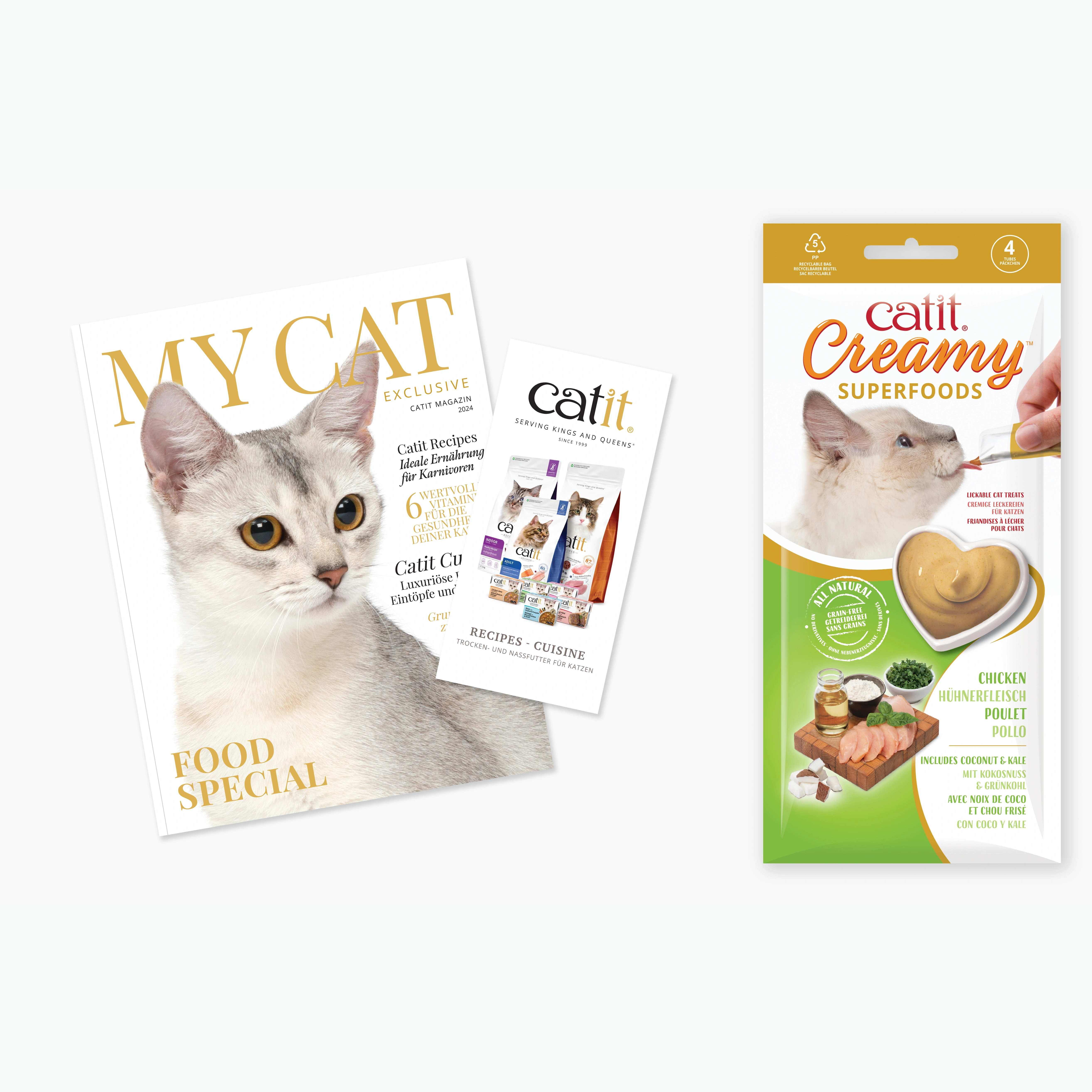 1 x 4er-Pack Catit Creamy Superfoods Hühnerfleisch mit Kokosnuss und Grünkohl 1 Catit Messbecher für Recipes Trockenfutter 1 exklusives Catit Magazin „My Cat“