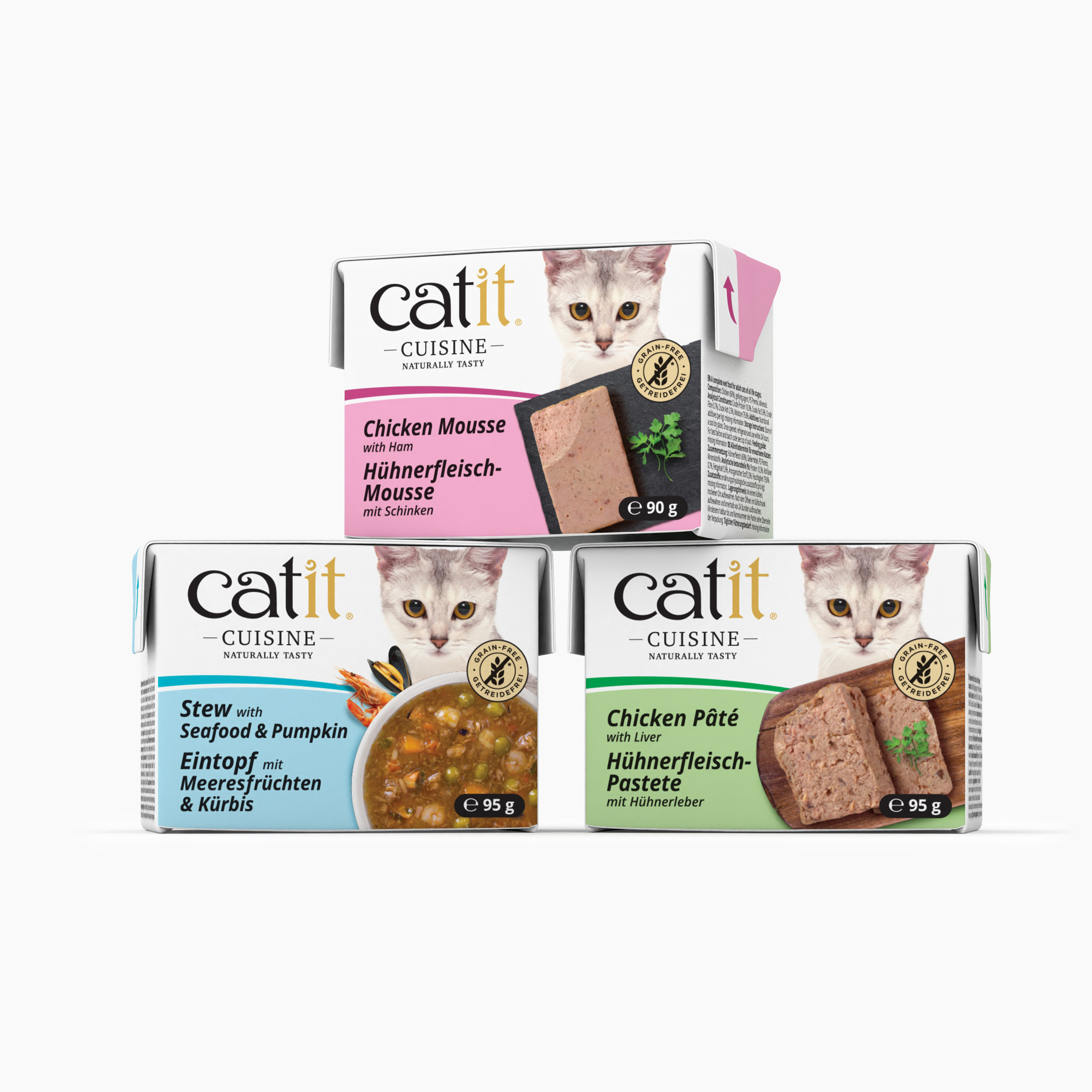 1 x 95 g Catit Cuisine Hühnerfleischpastete mit Hühnerleber 1 x 90 g Catit Cuisine Hühnerfleischmousse mit Schinken 1 x 95 g Catit Cuisine Eintopf mit Meeresfrüchten