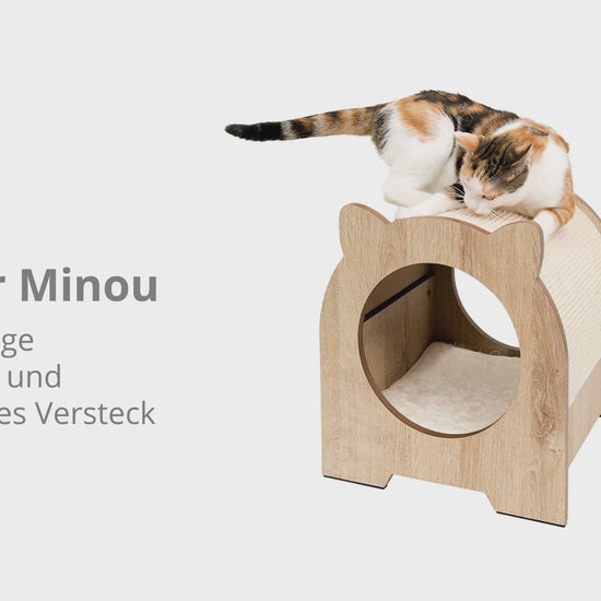 Lernen Sie Minou kennen: Minou ist eine stylische Kratzbank und ein Versteck in einem.